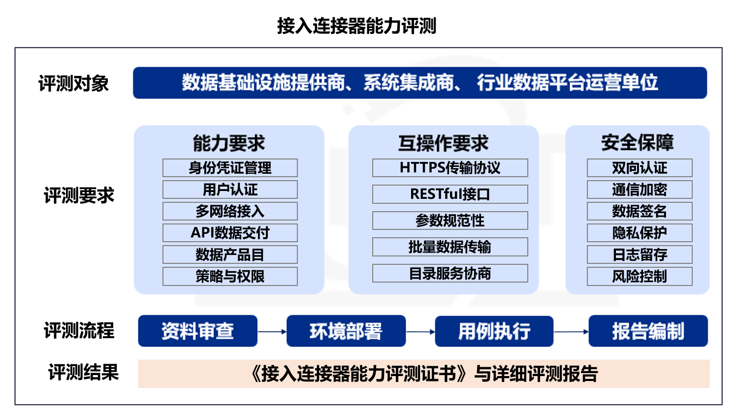 接入连接器能力评测主要面向数据基础设施提供商、系统集成商、行业数据平台运营单位等多类主体,依据《数据基础设施 接入连接器技术要求》等相关标准与规范,全面检验接入连接器在身份管理、网络接入、数据交付、日志审计、安全防护等方面的技术合规性与系统成熟度。评测结果符合要求的单位,将获得中国信通院颁发的《接入连接器能力评测证书》与详细评测报告,为其产品与系统进入数据流通领域提供权威能力背书。